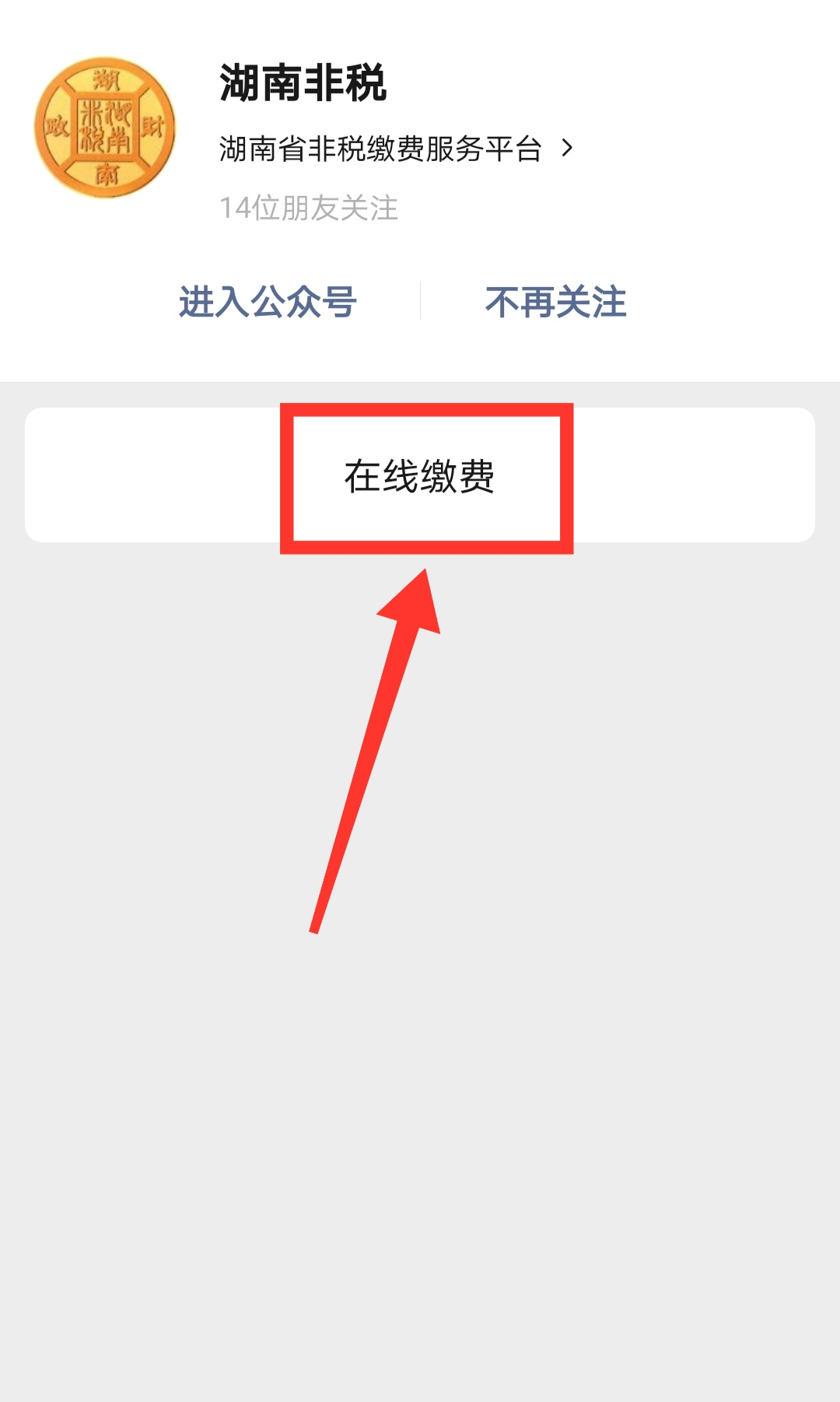 ① 认准“湖南非税”公众号,关注后点击“在线缴费”