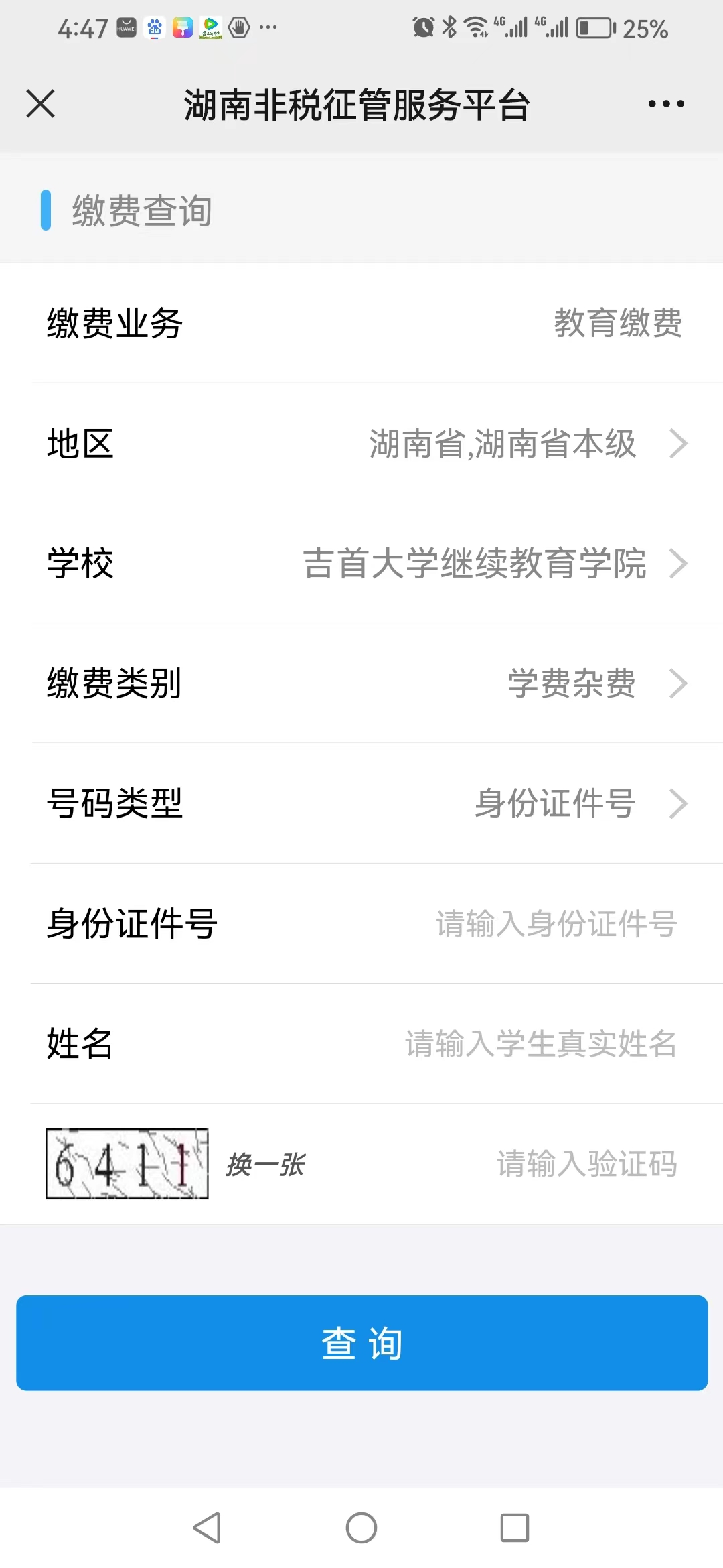 ③填写个人信息后点击“查询” (注意:学校要选择“吉首大学继续教育学院”,不要选择“吉首大学”)
