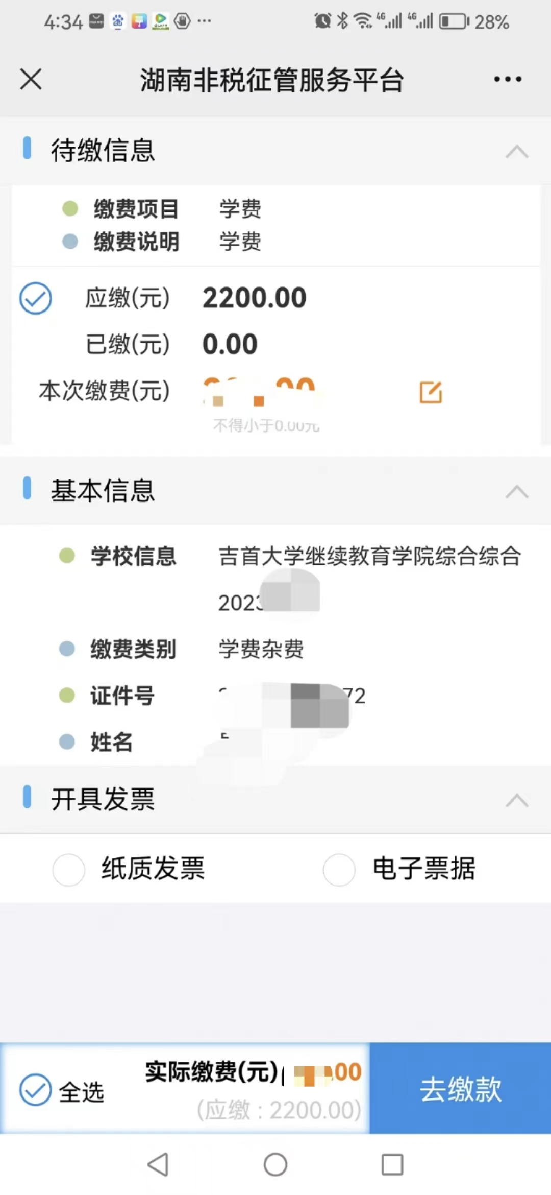 ④务必仔细核对基本信息及缴费金额,确认无误后点击“去缴款”