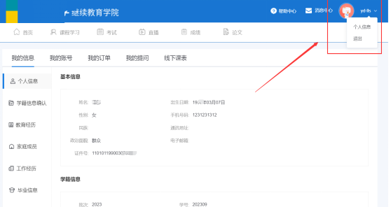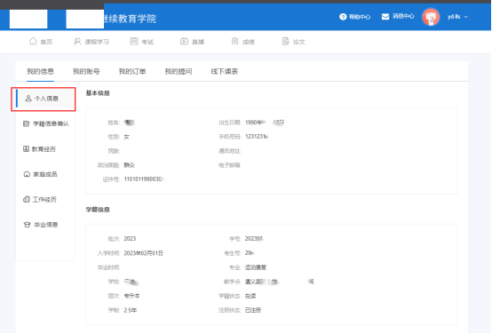 点击进入界面后,可查看“个人基本信息、学籍信息、教育经历、家庭成员、工作经历”
